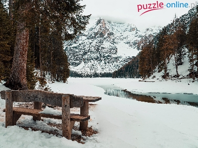 Ławka, Włochy, Dolina Hochpustertal, Jezioro Pragser Wildsee, Dolomity, Zima, Góry, Południowy Tyrol