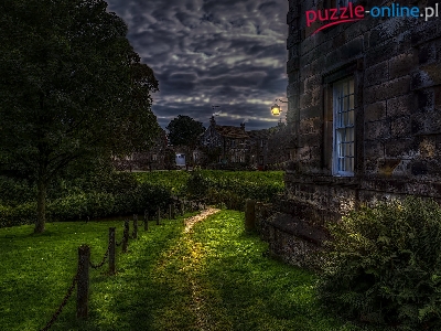Paproć, Drzewa, Ścieżka, Wieś Threshfield, Anglia, Ogrodzenie, Domy, Noc, Craven