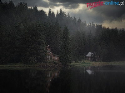 Domy, Chmury, Las, Jezioro, Ciemne