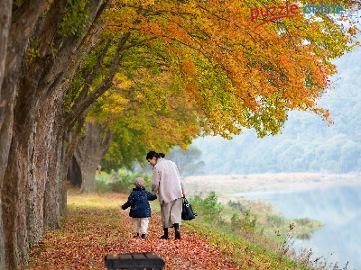 Kobieta, Drzewa, Spacer, Jesień, Jezioro, Dziecko