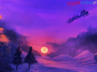 Sanie, Zima, Grafika, Noc, Drzewa, Mikołaj