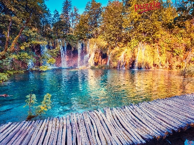 Jezioro, Drzewa, Chorwacja, Wodospad, Pomost, Park Narodowy Jezior Plitwickich