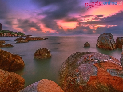 Kamienie, Latarnia morska, Chmury, Morze, Skały, Zachód słońca