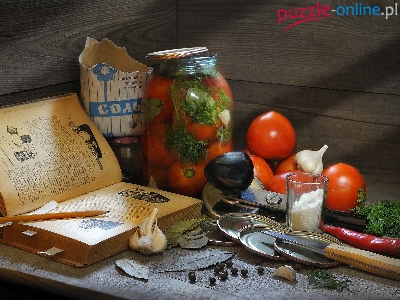Nóż, Papryka, Słoik, Czosnek, Przetwory, Książka, Ołówek, Pomidory, Koper, Przyprawy