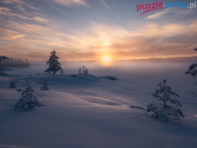Drzewa, Wschód słońca, Zima, Ośnieżone, Mgła