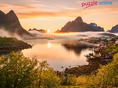 Lofoty, Wschód słońca, Góry, Wieś Reine, Domy, Norwegia, Morze Norweskie, Mgła