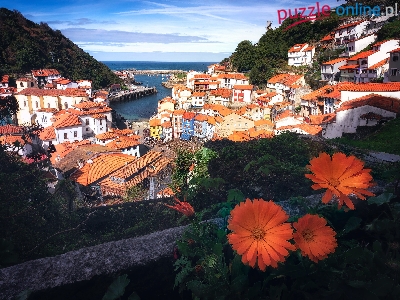 Domy, Wzgórza, Kwiaty, Cudillero, Hiszpania, Dachy, Zalesione, Pomarańczowe, Asturia