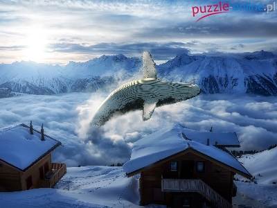 Chaty, Fantasy, Wieloryb, Domy, Chmury, Góry, Śnieg, Zima