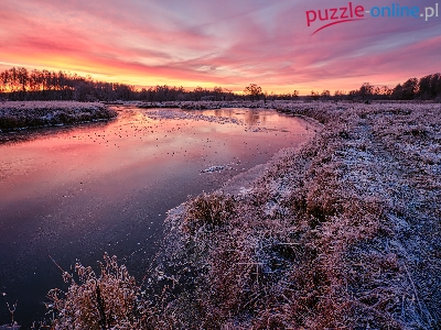 Puzzle Szron, Rzeka, Drzewa, Wschód słońca
