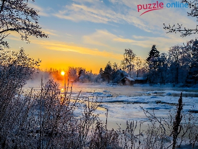Domy, Rzeka, Wschód słońca, Siikakoski, Finlandia, Drzewa, Zima, Oszronione, Kotka