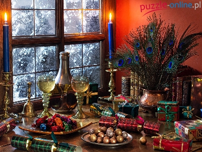 Wazon, Świeca, Pióra, Wino, Słodycze, Książki, Okno, Kompozycja, Prezenty, Pawie