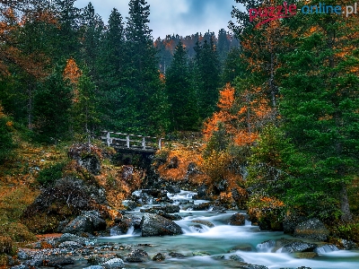 Jesień, Kamienie, Rzeka, Pożółkłe, Drzewa, Las, Zielone, Mostek