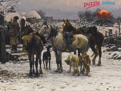 Psy, Postacie, Alfred Wierusz-Kowalski, Dom, Konie, Zima, Reprodukcja obrazów