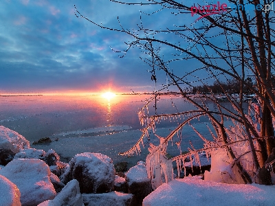 Jezioro, Lód, Drzewo, Kamienie, Słońce, Zima, Wschód, Sople