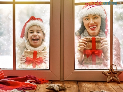 Kobieta, Prezenty, Śnieg, Okno, Boże Narodzenie, Dziecko, Czapki