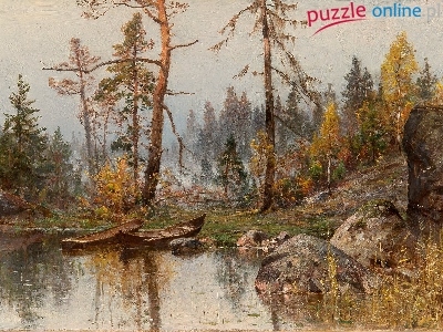 Łódki, Kamienie, Hjalmar Munsterhjelm, Las, Jezioro, Drzewa, Malarstwo