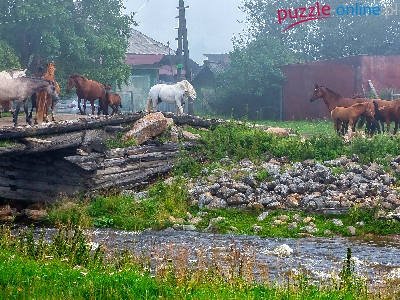 Rzeka, Kamienie, Domy, Konie, Mostek, Trawa