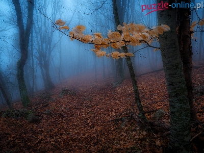 Las, Gałązka, Liście, Drzewa, Jesień, Mgła, Pożółkłe