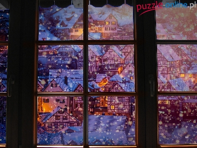 Boże Narodzenie, Oświetlenie, Grafika, Śnieg, Okno, Domy, Dekoracja