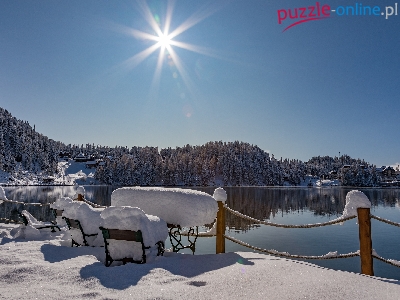Styria, Zima, Domy, Jezioro Turracher See, Lasy, Austria, Wzgórza, Promienie słońca