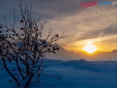 Góry, Dolina Engadyna, Szwajcaria, Wschód słońca, Zima, Krzew, Kanton Gryzonia