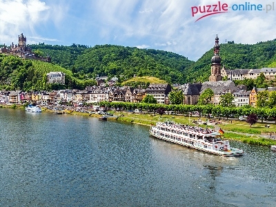 Wzgórza, Statek, Niemcy, Zamek Reichsburg, Miasto Cochem, Rzeka Mozela, Kościół, Domy