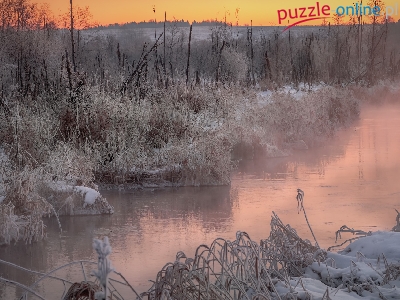 Mgła, Rosja, Czusowaja, Szron, Rzeka, Wschód słońca, Trawy, Kraj Permski
