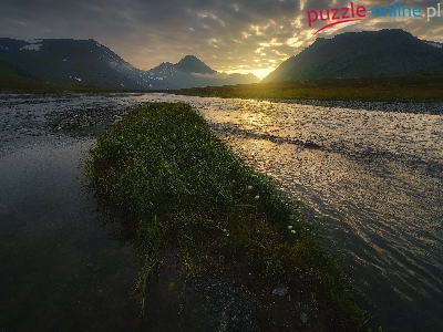 Kępy, Wschód słońca, Góry, Rzeka, Trawy