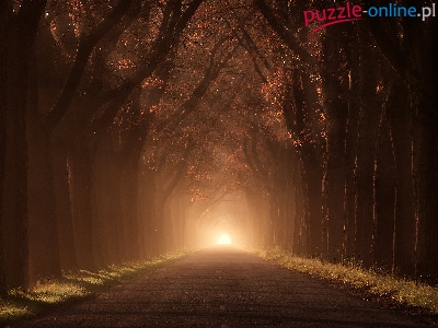 Mgła, Jesień, Drzewa, Las, Droga, Rozświetlona