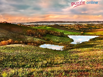 Wzgórza, Mucigliani, Włochy, Roślinność, Zachód słońca, Jeziora, Toskania