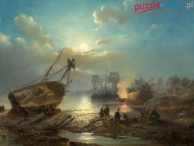 Henri Adolphe Schaep, Obraz, Żaglowce, Mgła, Domy, Jezioro, Malarstwo, Wschód słońca, Ludzie