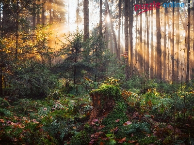 Drzewa, Omszały, Paprocie, Słoneczne, Las, Przebijające światło, Pień