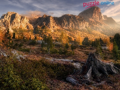 Góry, Drzewa, Włochy, Jesień, Przełęcz Falzarego Pass, Dolomity, Korzeń