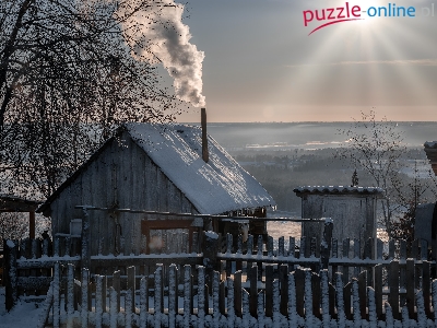 Śnieg, Promienie słońca, Ogrodzenie, Mróz, Dym, Zima, Dom, Płot