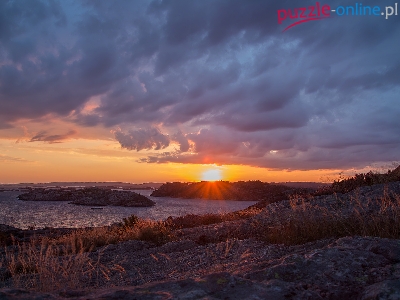 Skały, Morze, Zachód słońca, Chmury, Trawa