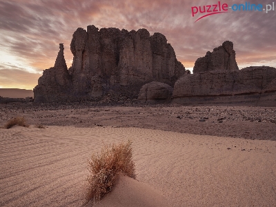 Sahara, Afryka, Zachód słońca, Skały, Trawy, Pustynia, Kępki, Algieria