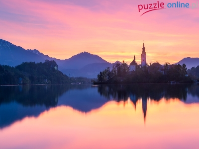 Jezioro Bled, Góry Alpy Julijskie, Odbicie, Kościół Zwiastowania Marii Panny, Słowenia, Wyspa Blejski Otok, Wschód słońca