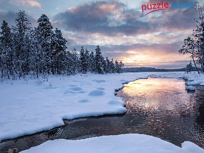 Rzeka, Chmury, Drzewa, Wschód słońca, Zima, Las