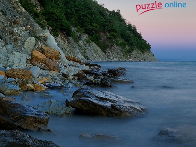 Kamienie, Poranek, Drzewa, Morze, Wybrzeże, Skały
