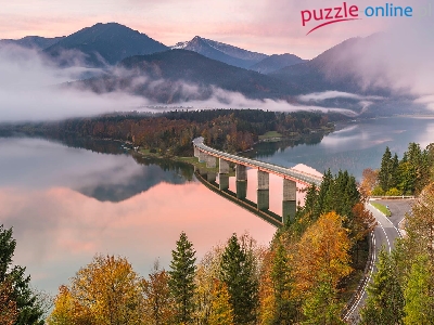 Góry, Most, Niemcy, Jezioro Sylvensteinsee, Jesień, Mgła, Bawaria