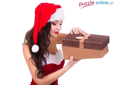 Mikołaja, Białe tło, Kobieta, Czapka, Prezent