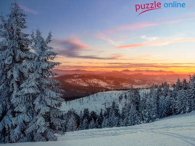 Drzewa, Zachód słońca, Zima, Ośnieżone, Góry