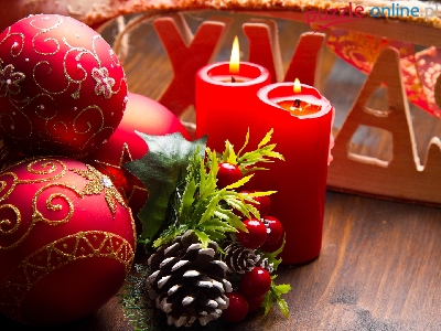 Czerwone, Gałązka, Napis, Szyszka, Boże Narodzenie, Bombki, Świece