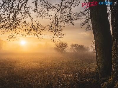 Puzzle Mgła, Pole, Drzewa, Wschód słońca