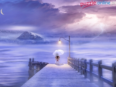 Dziewczyna, Pomost, Latarnia, Jezioro, Grafika, Pioruny, Chmury, Góry, Księżyc, Parasolka