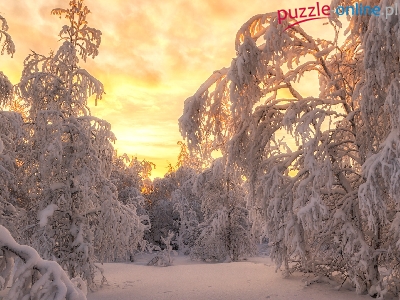 Gałęzie, Wschód słońca, Zima, Ośnieżone, Drzewa
