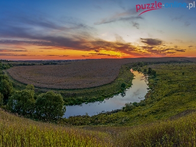 Chmury, Drzewa, Trawa, Rzeka, Wschód słońca, Zakole, Pola