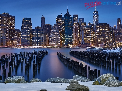 Nowy Jork, Zima, Zatoka, Manhattan, Morze, Stany Zjednoczone, Wieżowce, Noc