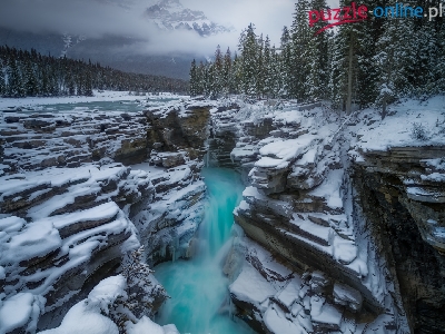 Park Narodowy Jasper, Wodospad, Kanada, Rzeka Athabasca, Zima, Skały, Alberta