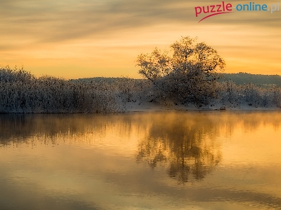 Odbicie, Szron, Wschód słońca, Zima, Drzewo, Jezioro